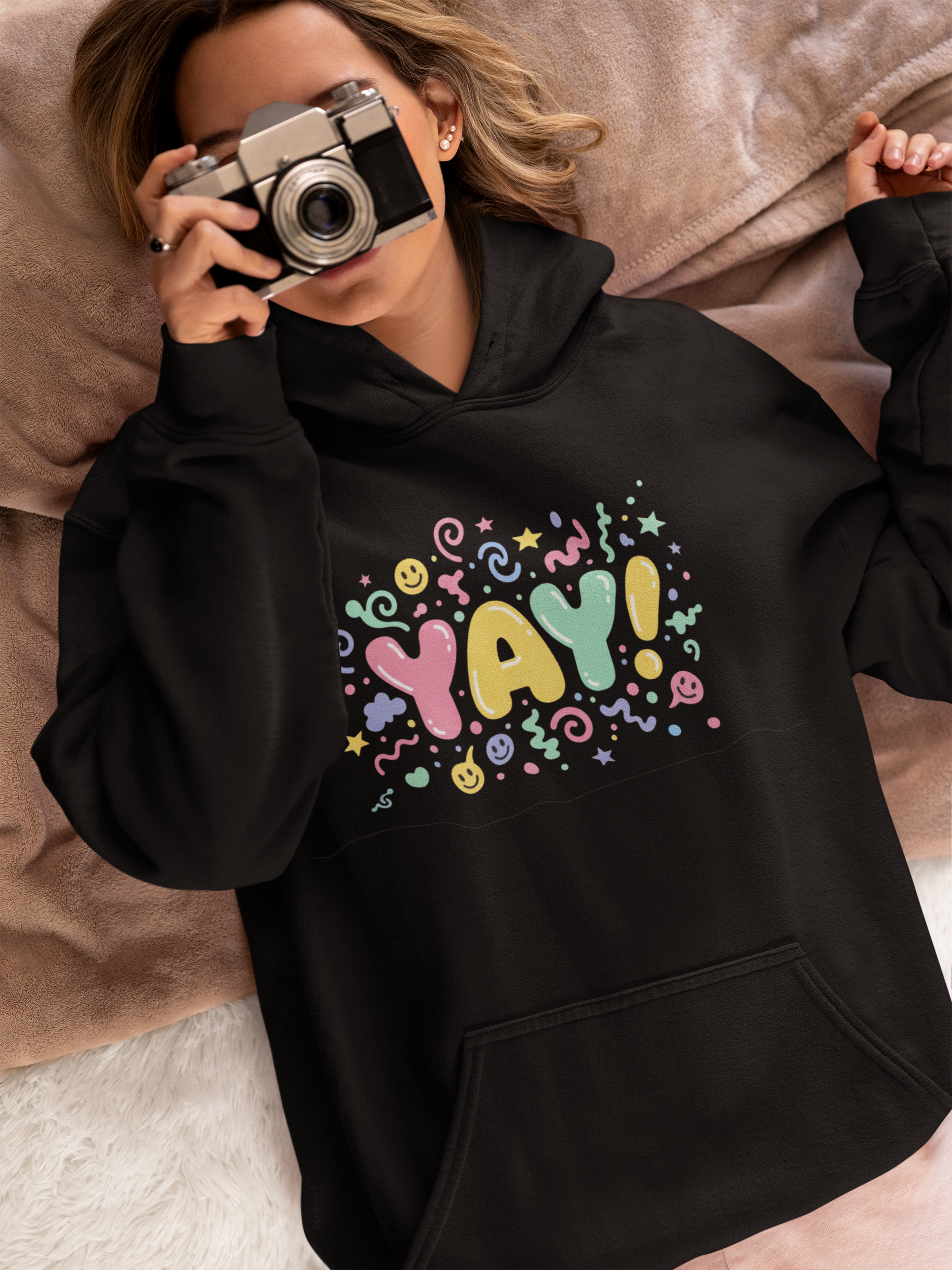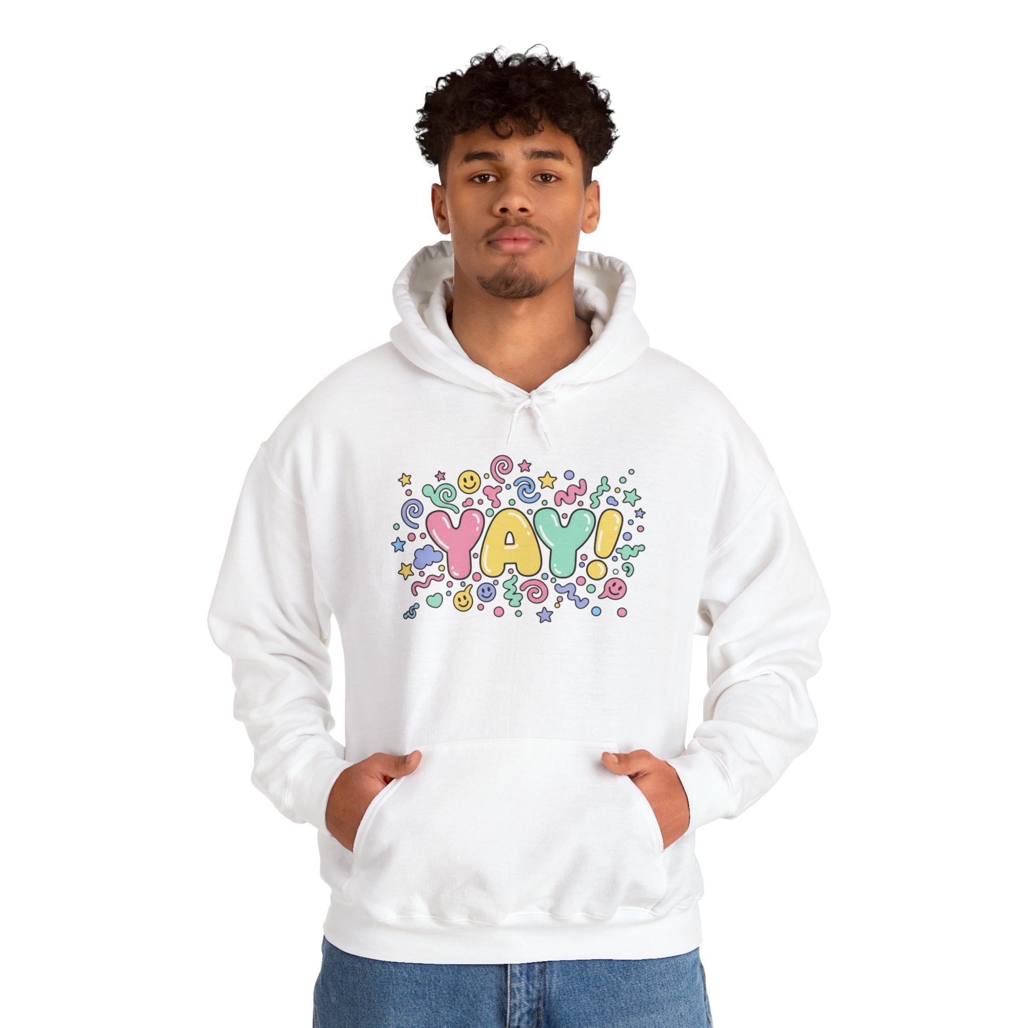Bubble-letter graphic on a cozy unisex hoodie that channels chaotic cute typography with candy-bright colors and wobbly, inflated lettering. The small chest artwork uses warped, playful fonts and a dense, jittery layout to create sugary, high-energy charm that reads like a micro-statement for youth culture and expressive wardrobes.